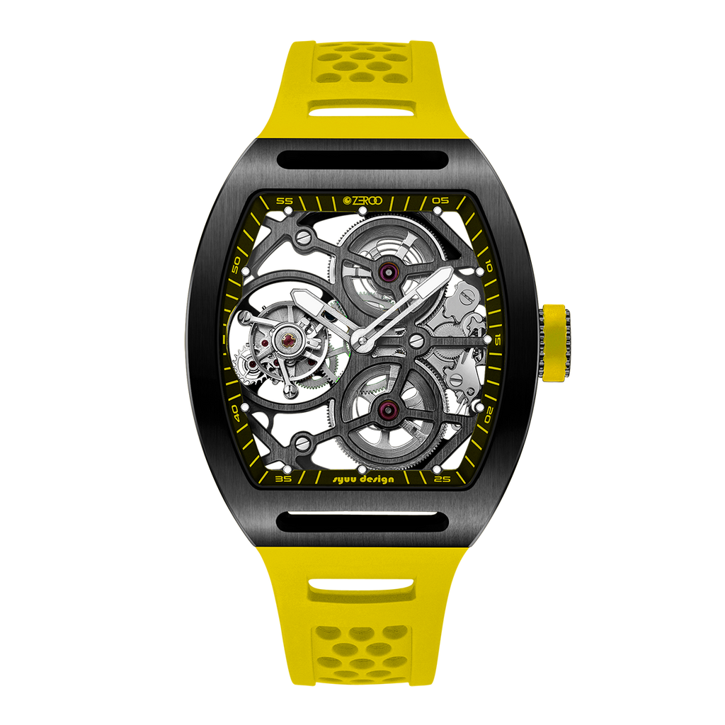 The T4−01 is a full skeleton tourbillon with a transparency that allows you to enjoy the exquisite movement of the flying tourbillon movement not only from the back side of the face but also from the side.