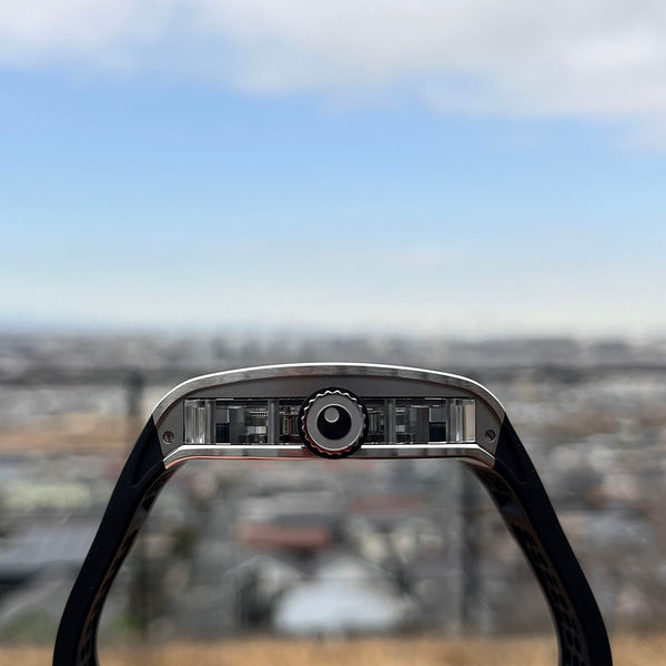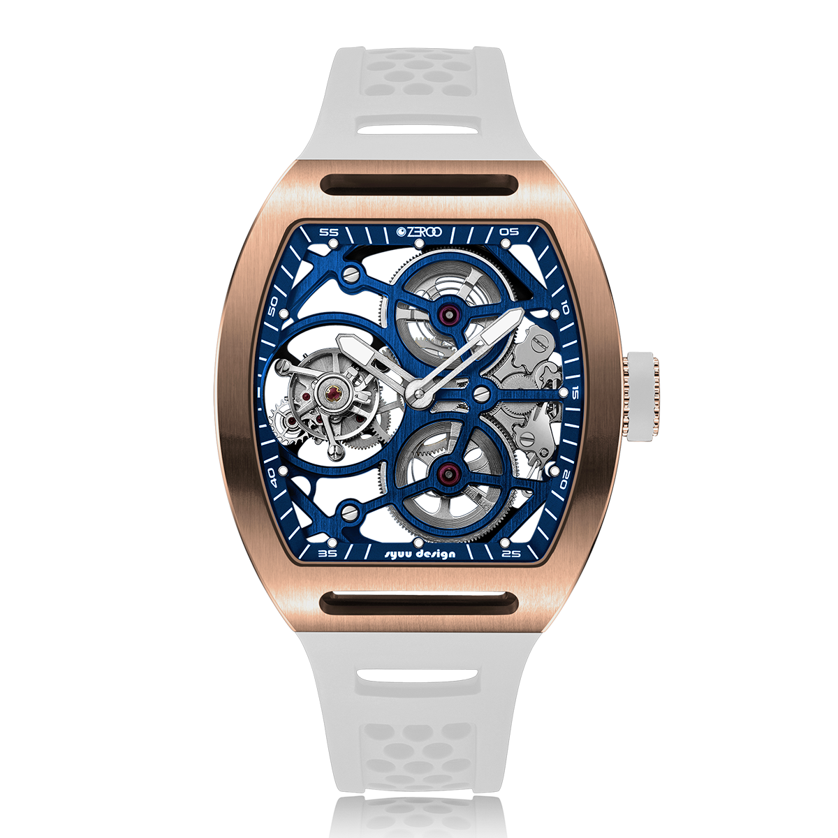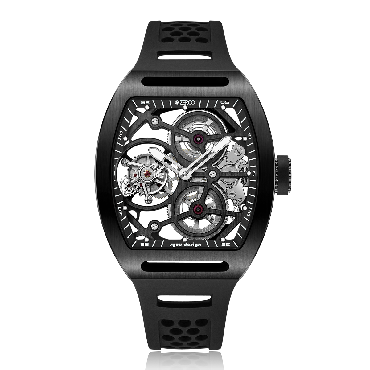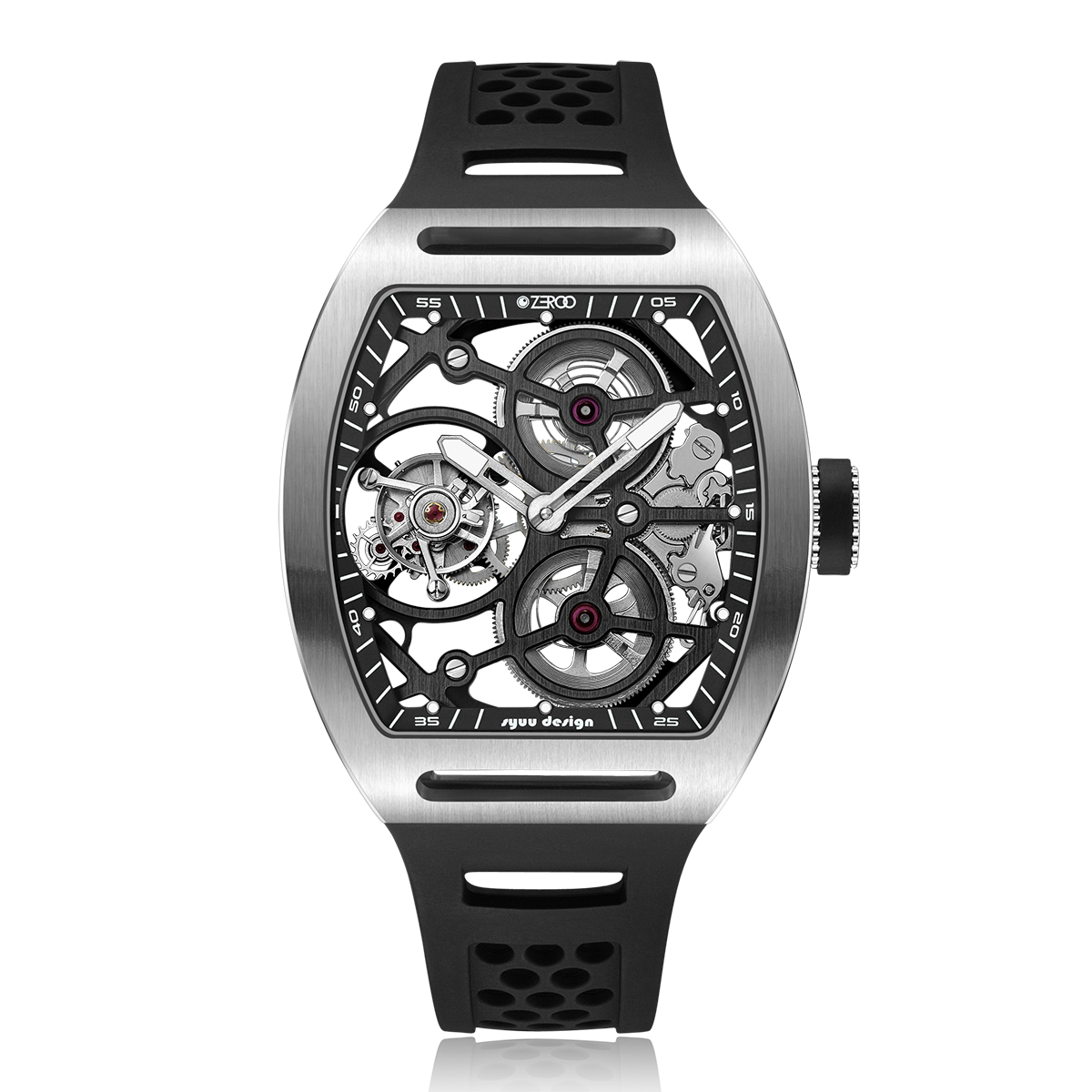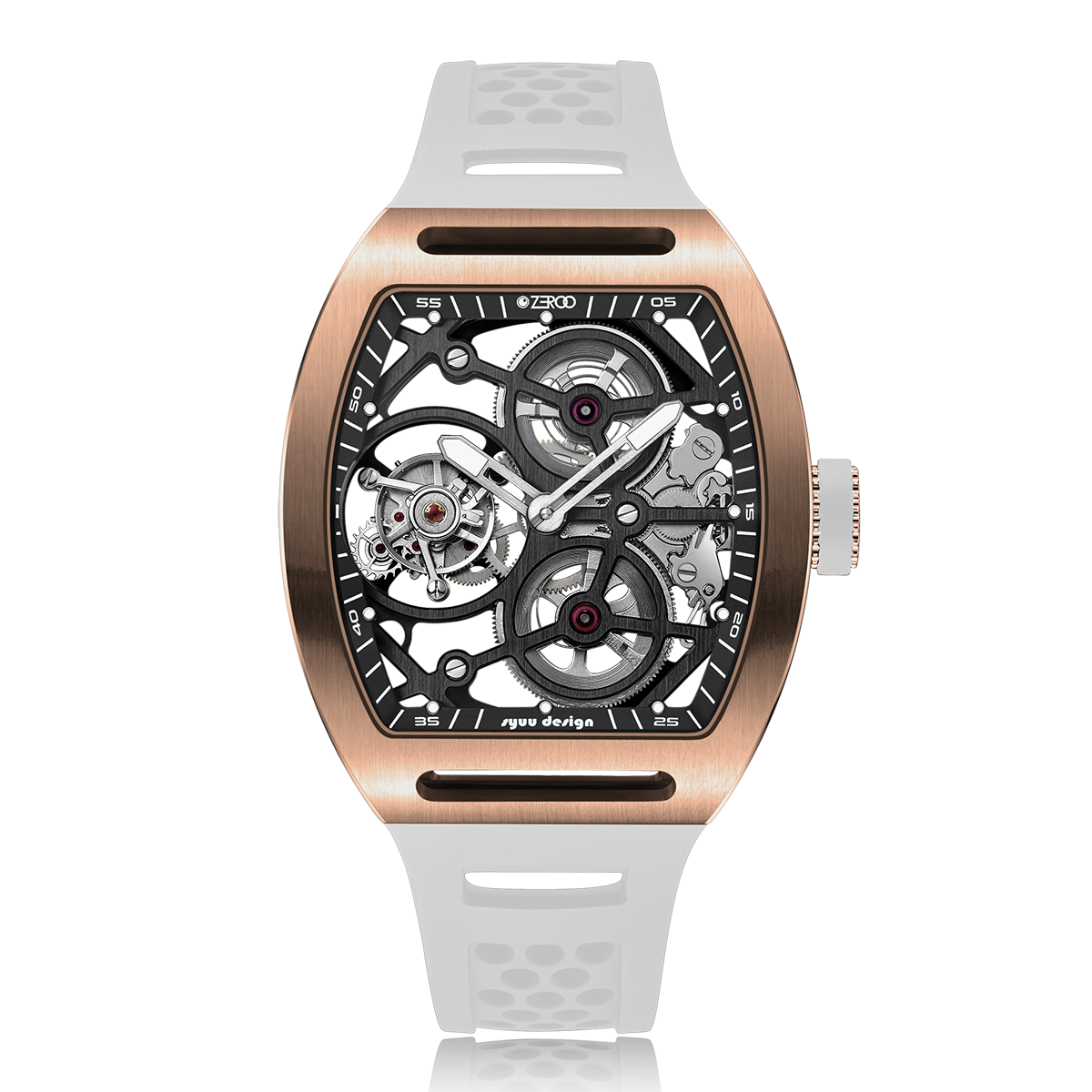 The T4−01 is a full skeleton tourbillon with a transparency that allows you to enjoy the exquisite movement of the flying tourbillon movement not only from the back side of the face but also from the side.
