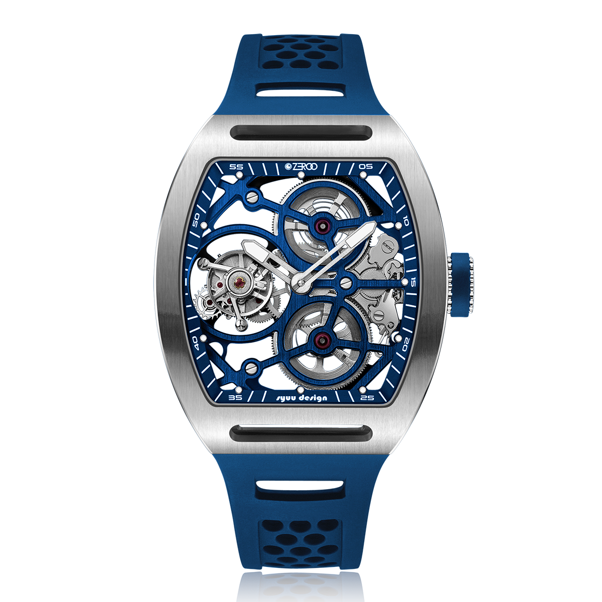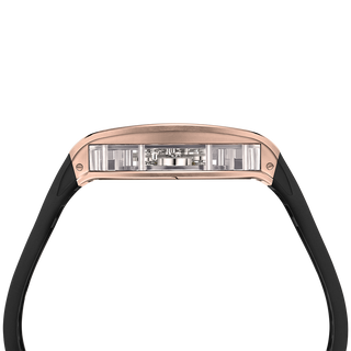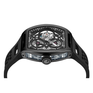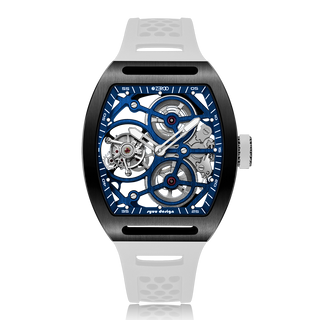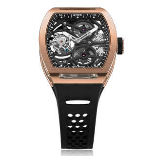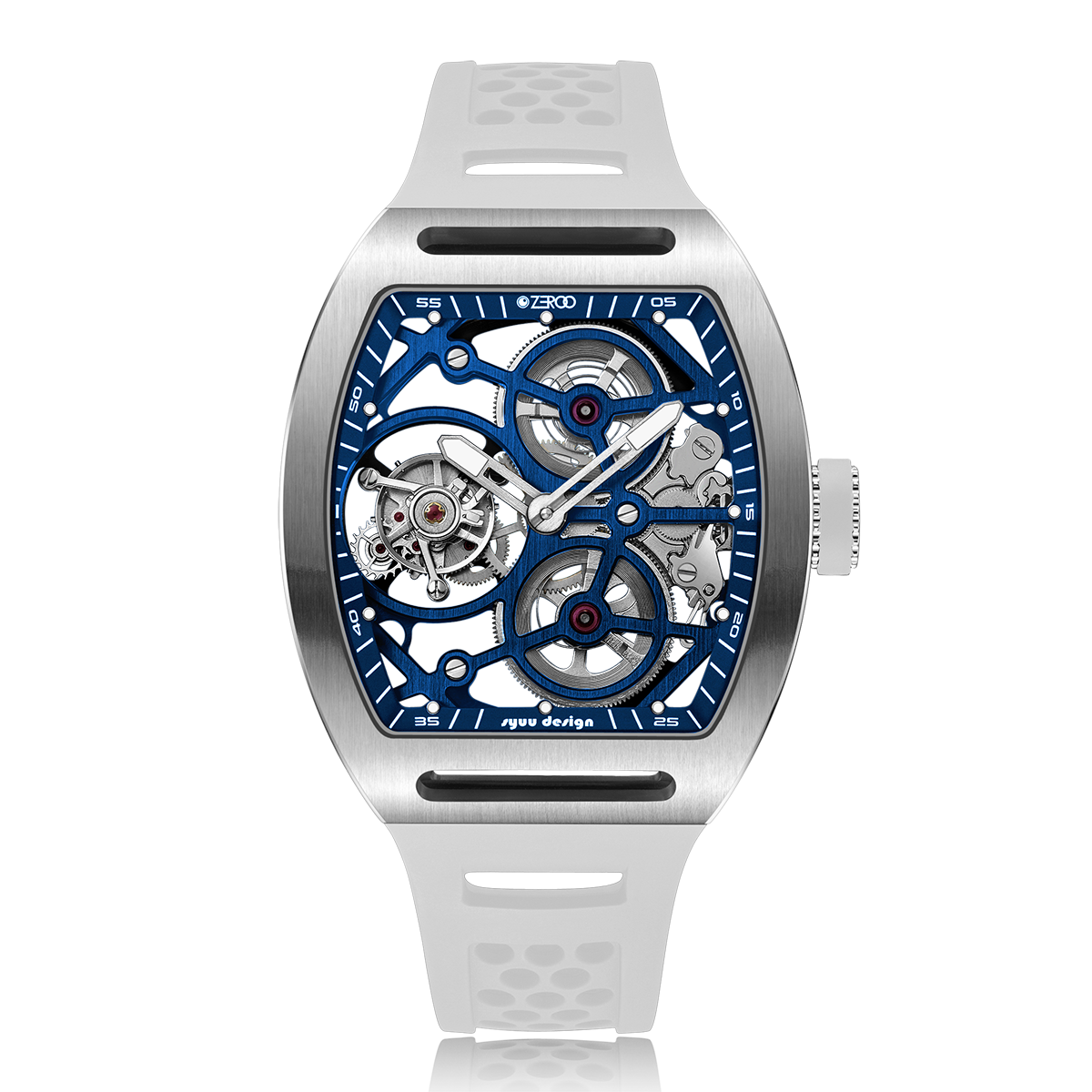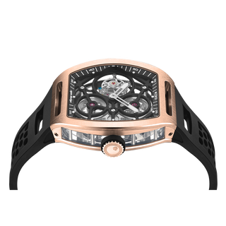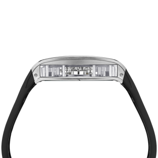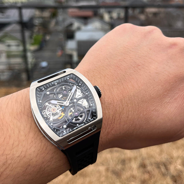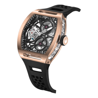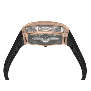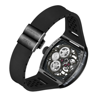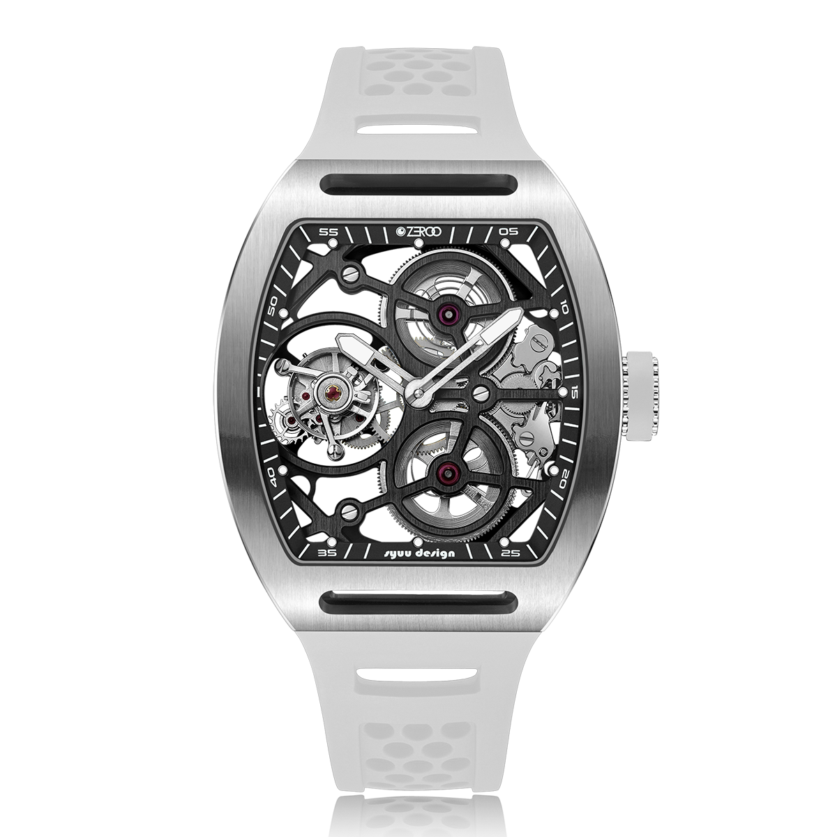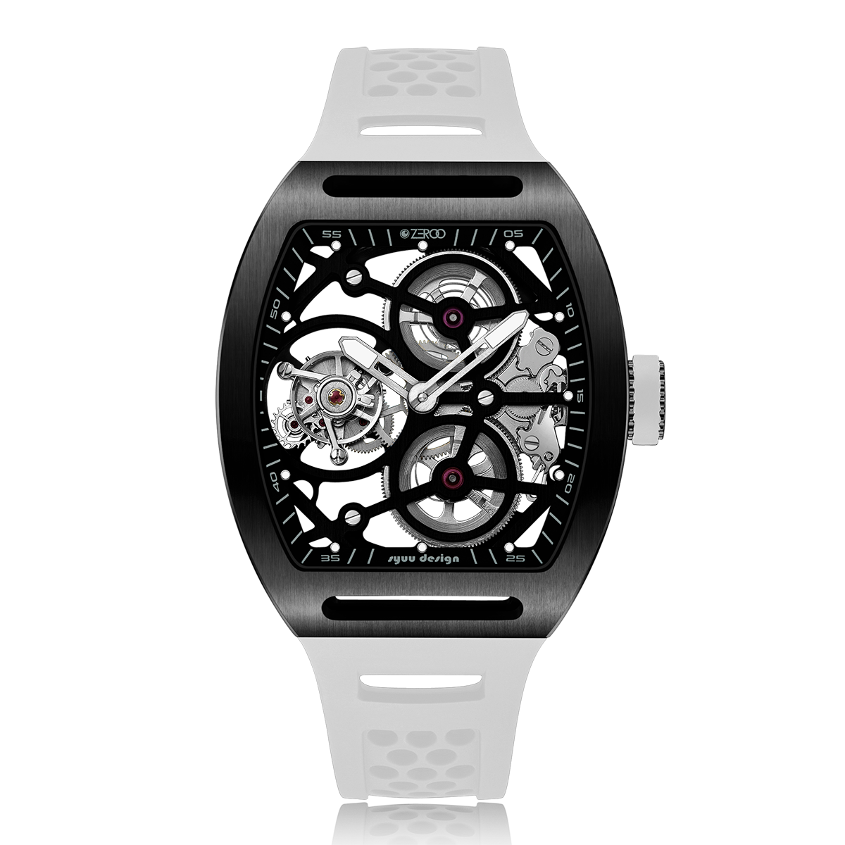 The T4−01 is a full skeleton tourbillon with a transparency that allows you to enjoy the exquisite movement of the flying tourbillon movement not only from the back side of the face but also from the side.
