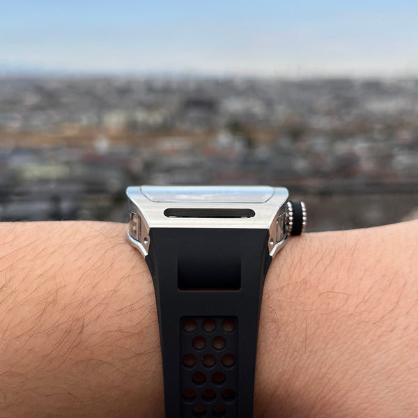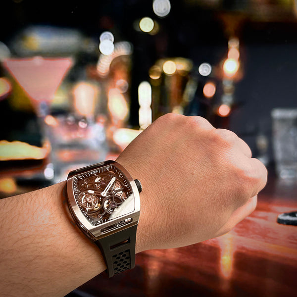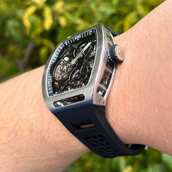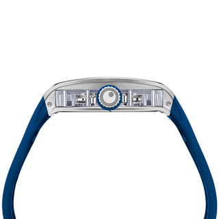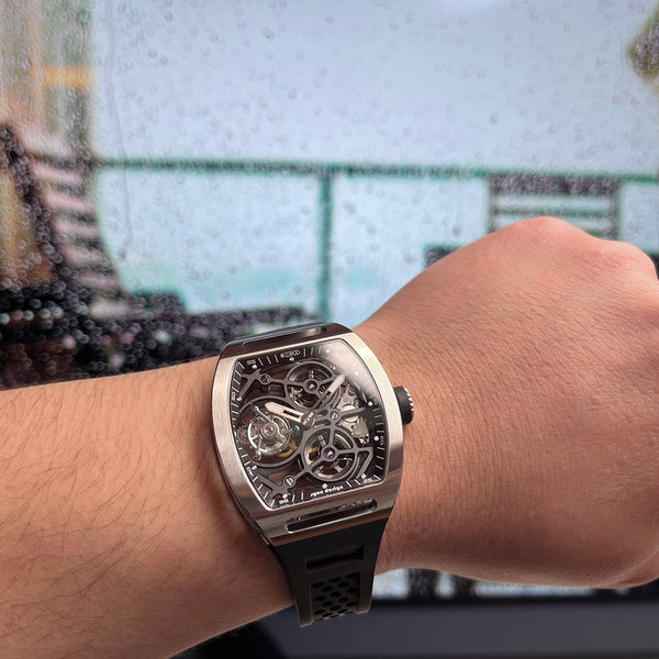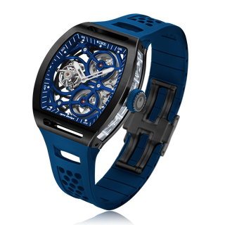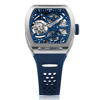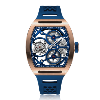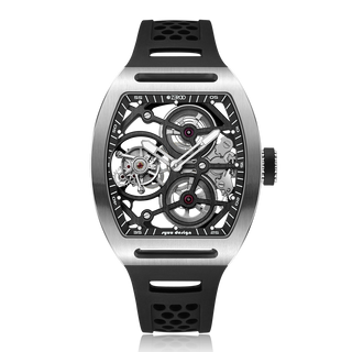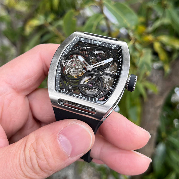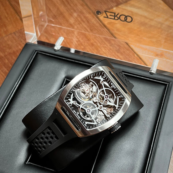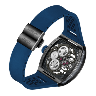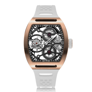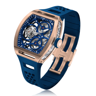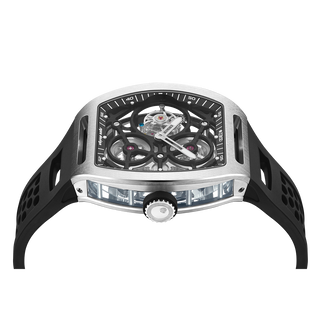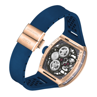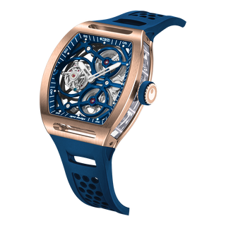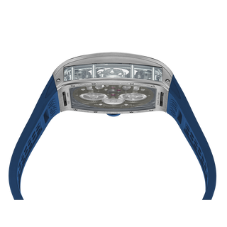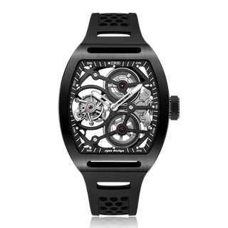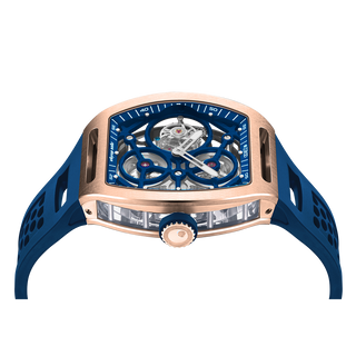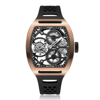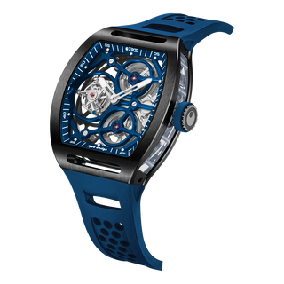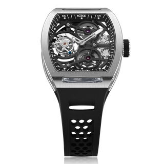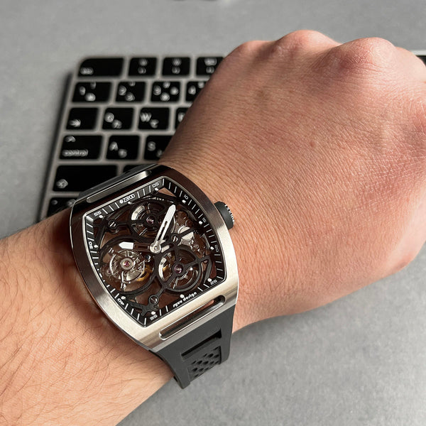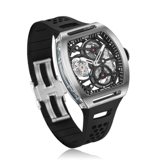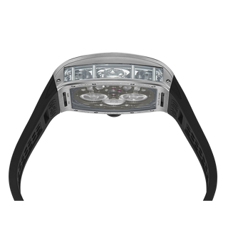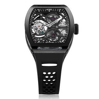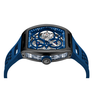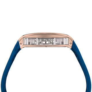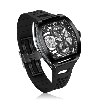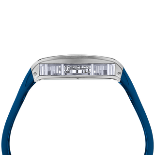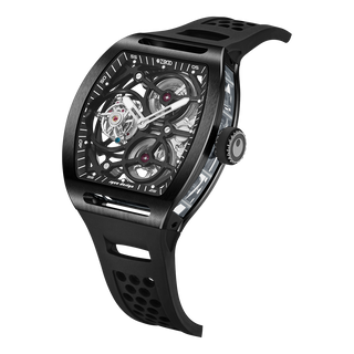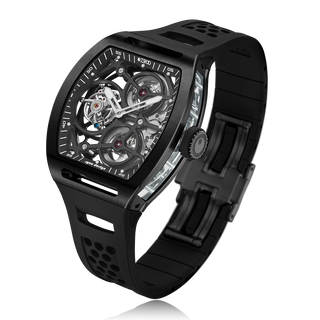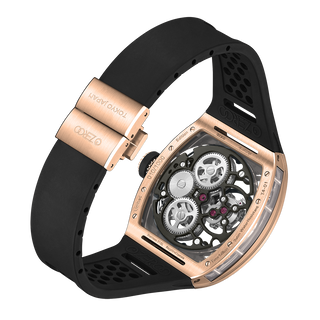 The T4−01 is a full skeleton tourbillon with a transparency that allows you to enjoy the exquisite movement of the flying tourbillon movement not only from the back side of the face but also from the side.