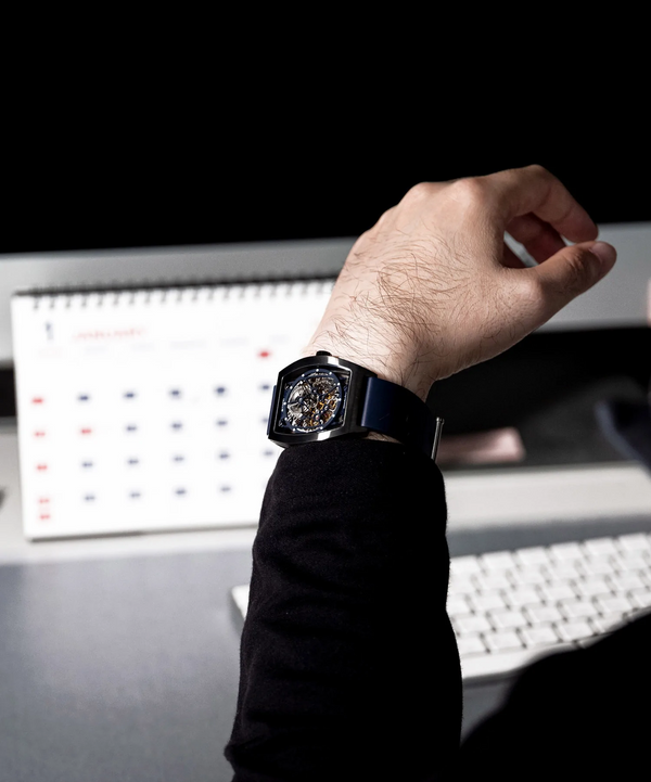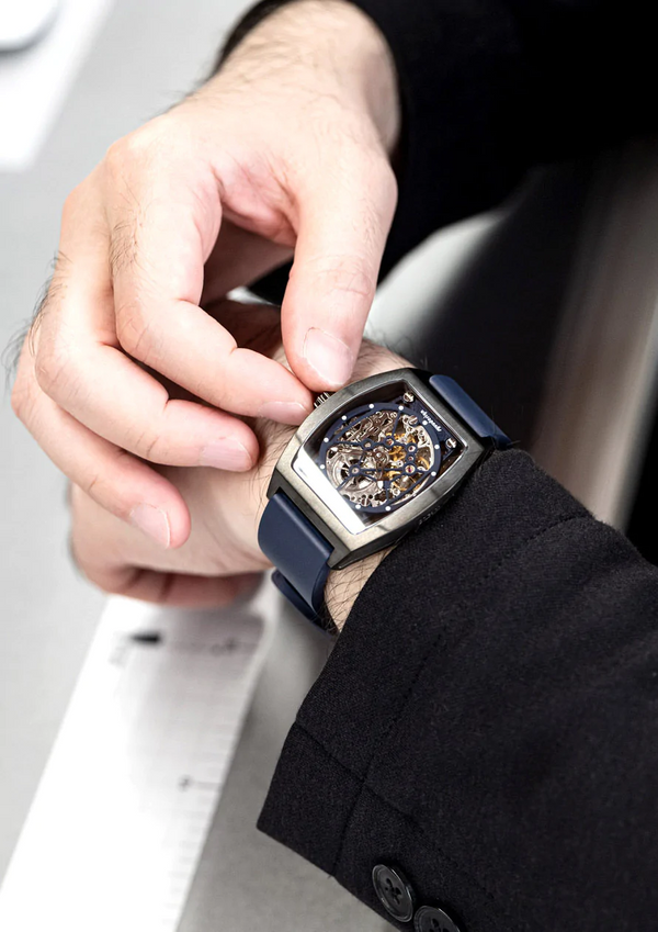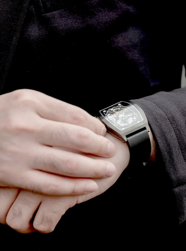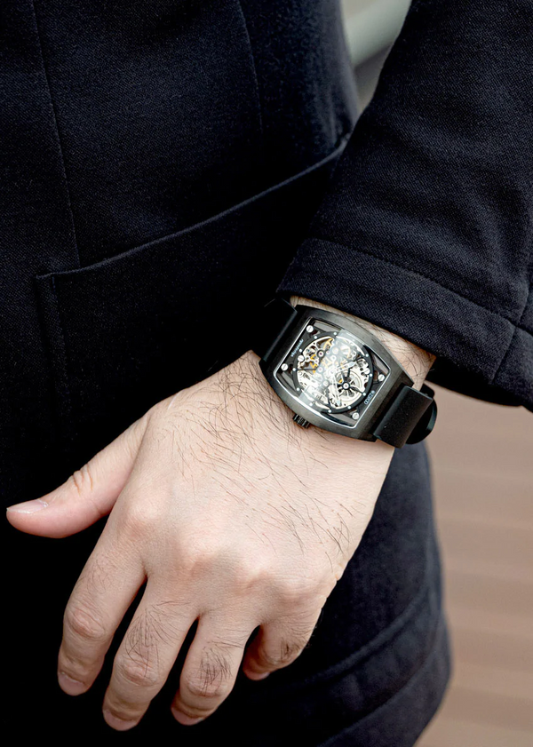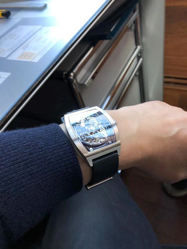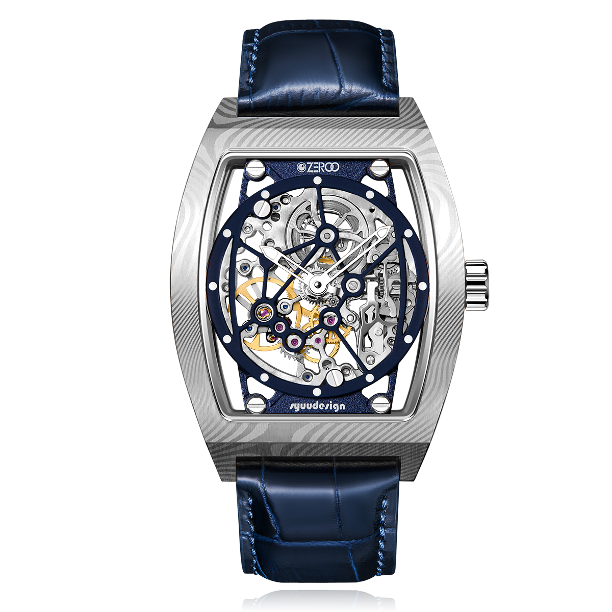 極薄の手巻きムーブメントをショウケースのように美しいトノー型のケースに収めたハンサムはスケルトンメカニカルウォッチ。ダマスカス鋼