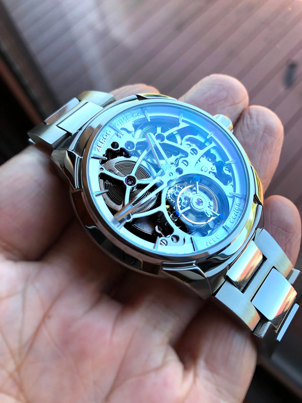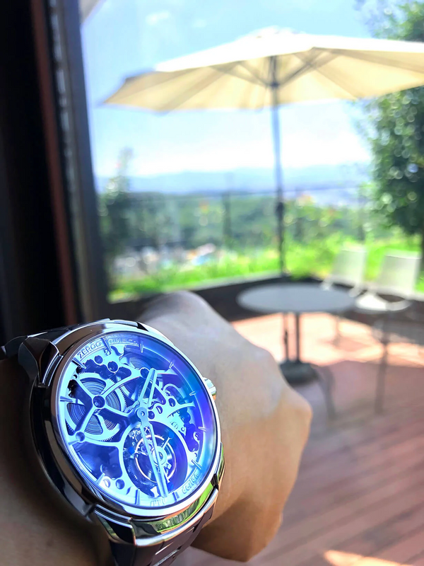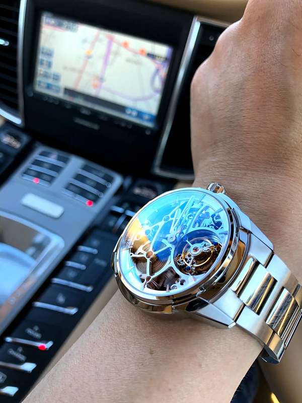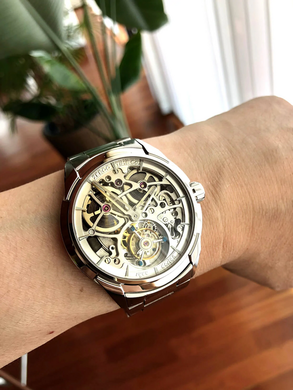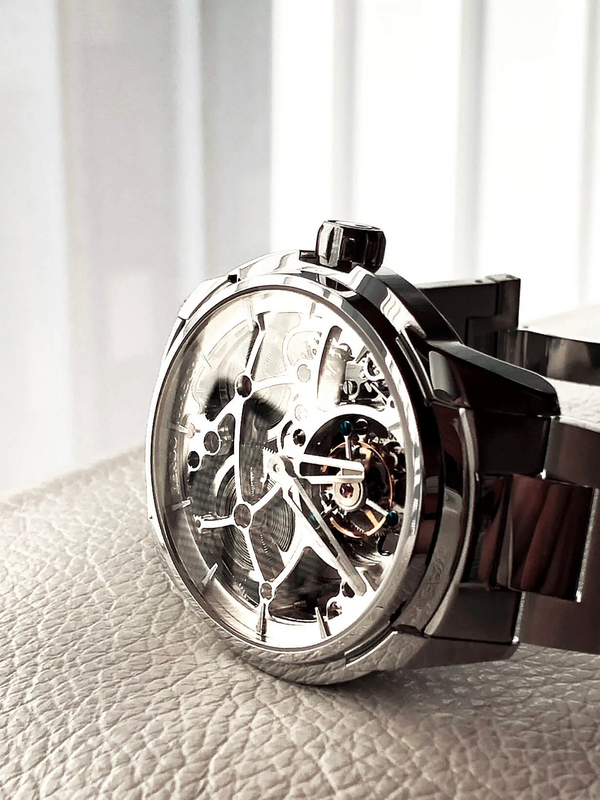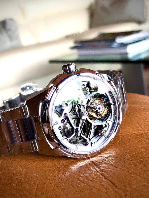 オートマチックスケルトントゥールビヨンを搭載。力強さをキーワードに開発が行われた美しいデザインを堪能できる一本。